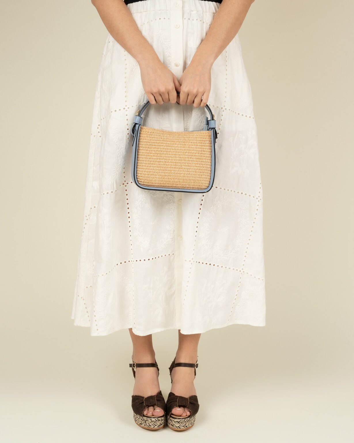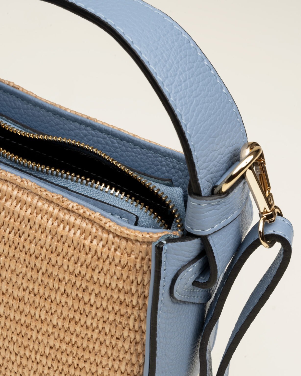 Balance es un bolso bandolera realizado en rafia combinada con detalles en piel, un diseño que aporta textura y un aire natural. El cierre de cremallera y su doble asa acompañan el gesto, permitiendo llevarlo al hombro o en la mano con naturalidad.